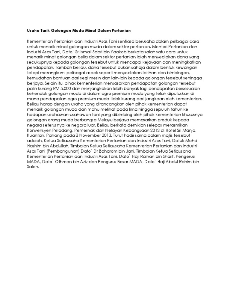 Galak Belia Ceburi Industri Pertanian from assets.bharian.com.my Dapatkan penjelasan bukan hanya jawaban. Jalur irigasi selalu menjadi penyangga utama untuk mengatasi masalah pengairan di lahan perkebunan dan pertanian. Cara mewujudkan rasa bela negara yang pertama tentunya adalah dengan menjunung sikap toleransi yang tinggi. Ianya bertujuan untuk membantu dan menggalakkan penglibatan golongan anak muda dalam bidang keusahawanan agro dalam sektor pertanian 5. Menurut perdana menteri, datuk seri najib tun razak ia mampu direalisasikan menerusi penglibatan dalam bidang keusahawanan. Generasi muda kini sangat bersemangat untuk menghentikan perubahan iklim. Kerajaan mahu mengubah sudut pemikiran rakyat khususnya generasi muda kepada pencipta pekerjaan daripada seorang mencari pekerjaan. Kerajaan perlu menyelesaikan masalah pasaran hasil pertanian.